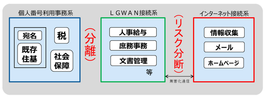 また、総務省が策定した「三層分離モデル」に基づき、マイナンバー関連の事務系システム、LGWAN接続系、インターネット接続系を明確に分けることで、情報流出を防ぐ仕組みが整備されています。