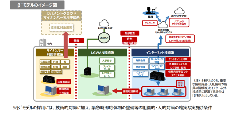 β′モデルは、βモデルをベースにしながら、ゼロトラストの考え方や高度なセキュリティ対策を取り入れた発展型です。柔軟な働き方やクラウド移行を推進しつつ、情報資産の安全性をさらに高めたい自治体に向いています。
