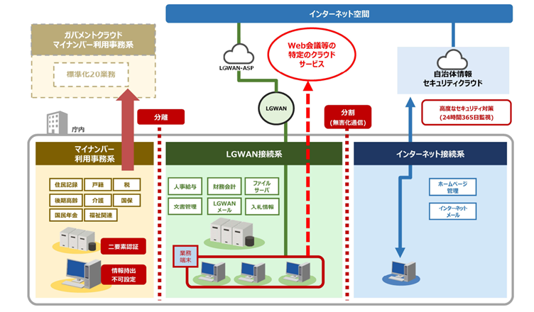- LGWAN接続系(文書管理・人事給与・財務など自治体業務システム)