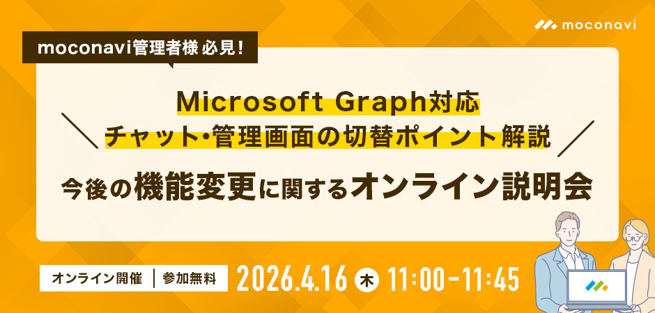 | セミナー名称 | Microsoft Graph対応/チャット・管理画面の切替ポイント解説 【moconavi管理者様必見】今後の機能変更に関するオンライン説明会 |